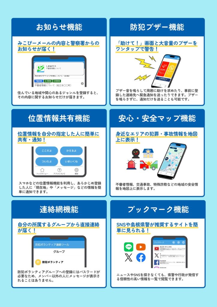 本アプリでは、不審者情報や事件・事故情報を地図上で確認できるほか、防犯ブザーや位置情報共有機能を搭載し、県民の安心・安全の向上を図ります。