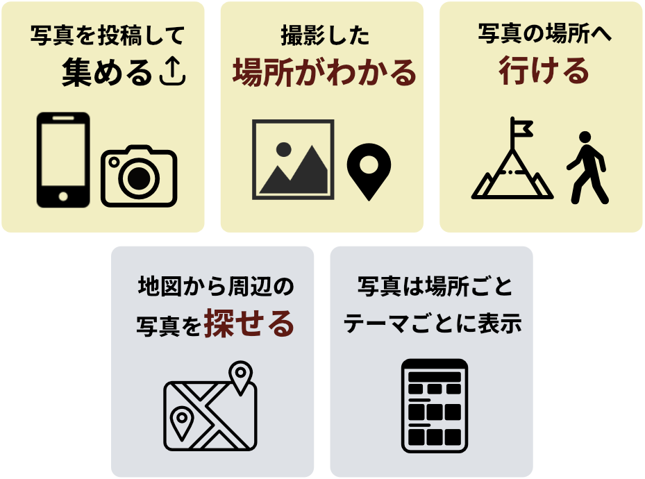 | 位置の可視化 | 地図上のスポットから写真を探せる |